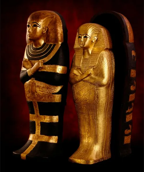 For Egyptians, it was essential that the whole body of the deceased be preserved in order for it to live on in the afterlife. During mummification, the internal organs were removed, dried and wrapped in bandages. Tutankhamun’s organs lay in miniature coffins, which were interred in an alabaster shrine. These so-called canopic shrines stood in a gilded wooden shrine, which was decorated with statues of the four goddesses of death.